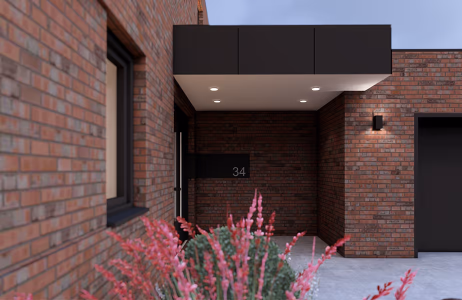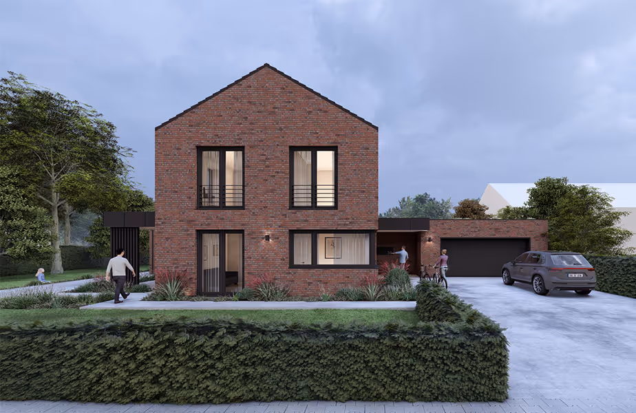 Dieser Entwurf eines modernen Einfamilienhauses mit Garage und Kellergeschoss wurde für ein Bauvorhaben in Wettringen erstellt. Das Satteldachhaus mit dunkelroter Klinkerfassade bietet großzügigen Wohnraum für eine vierköpfige Familie und erhält durch den überdachten, geschützten Eingangsbereich eine einladende Wirkung.